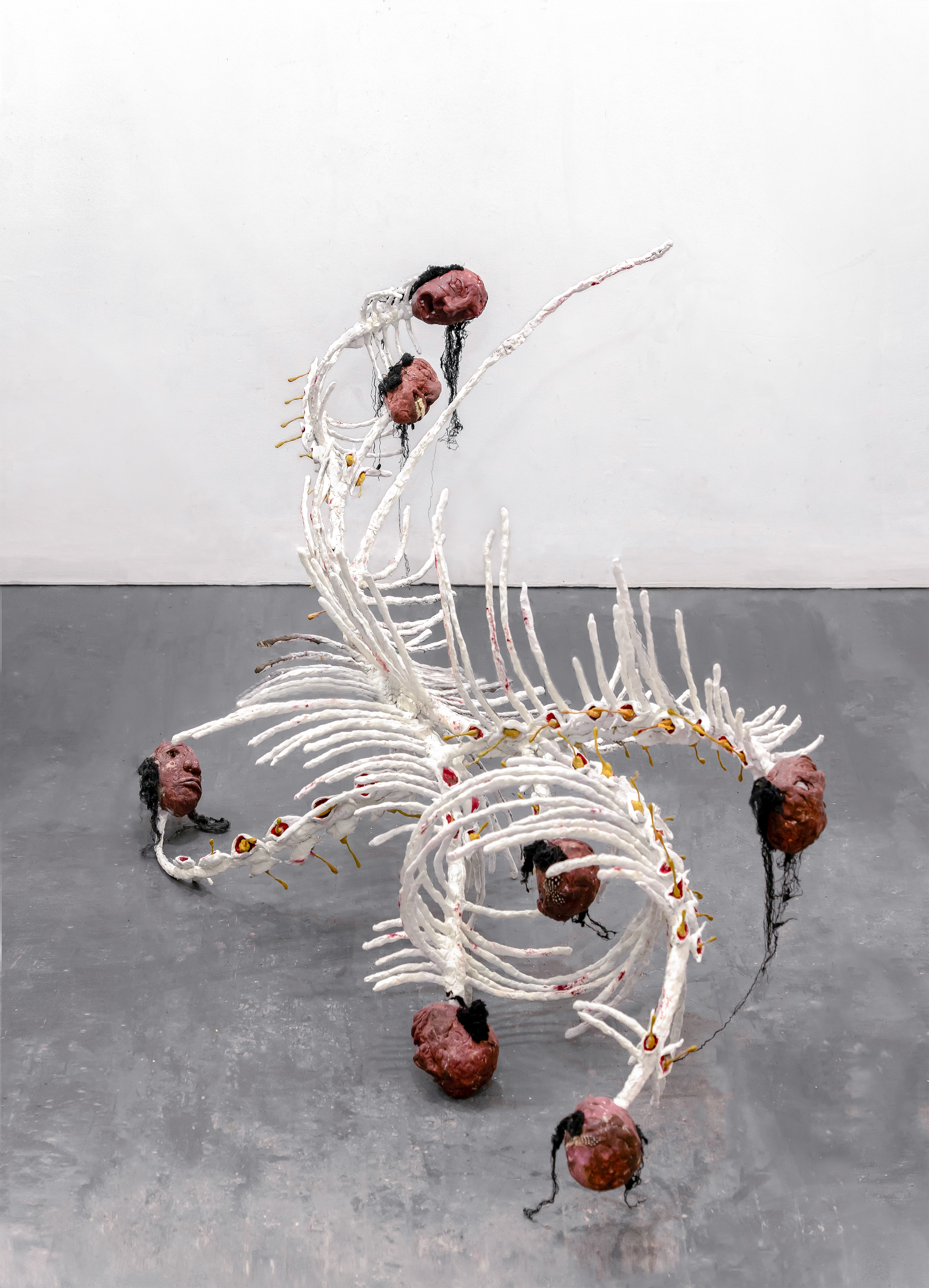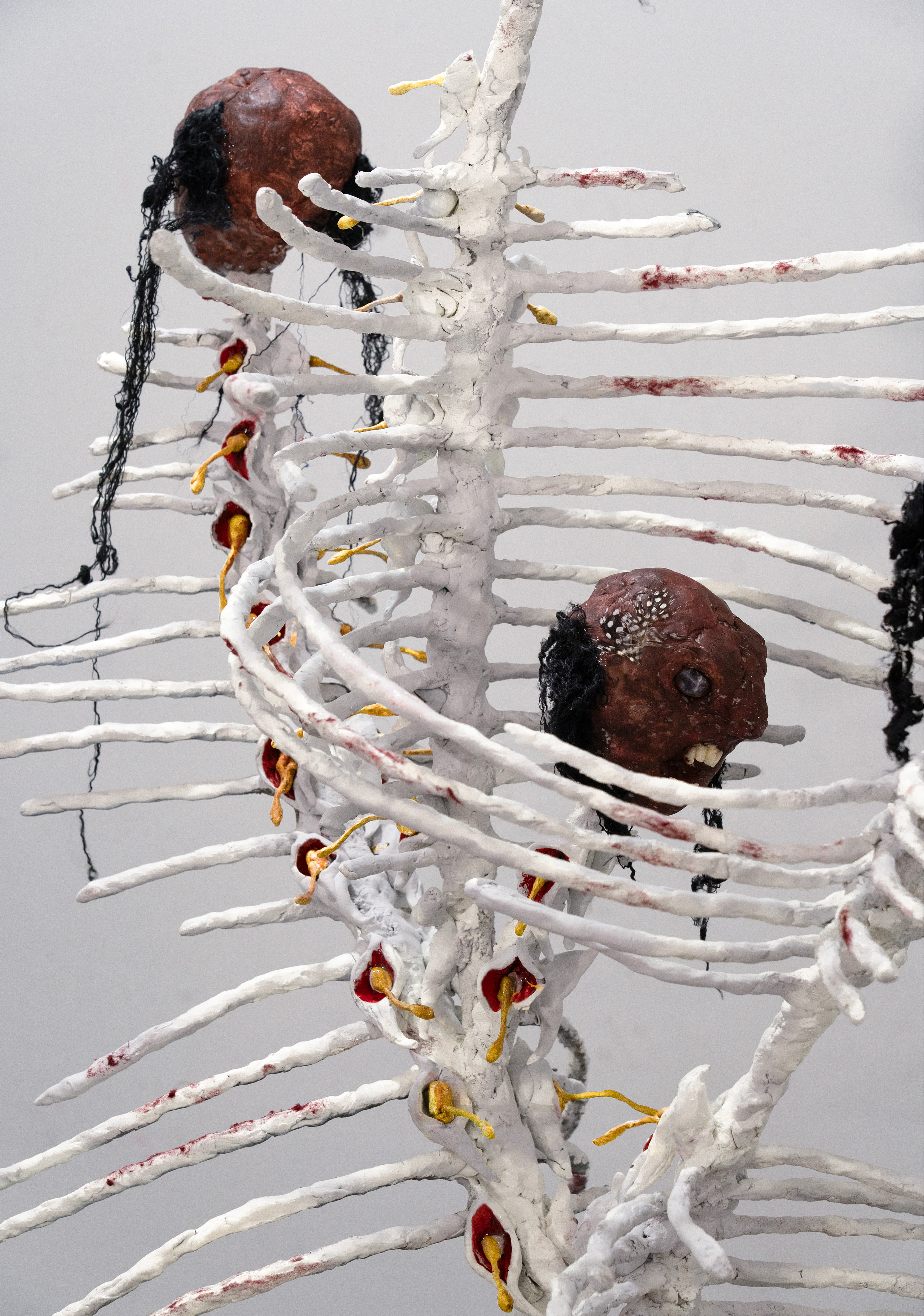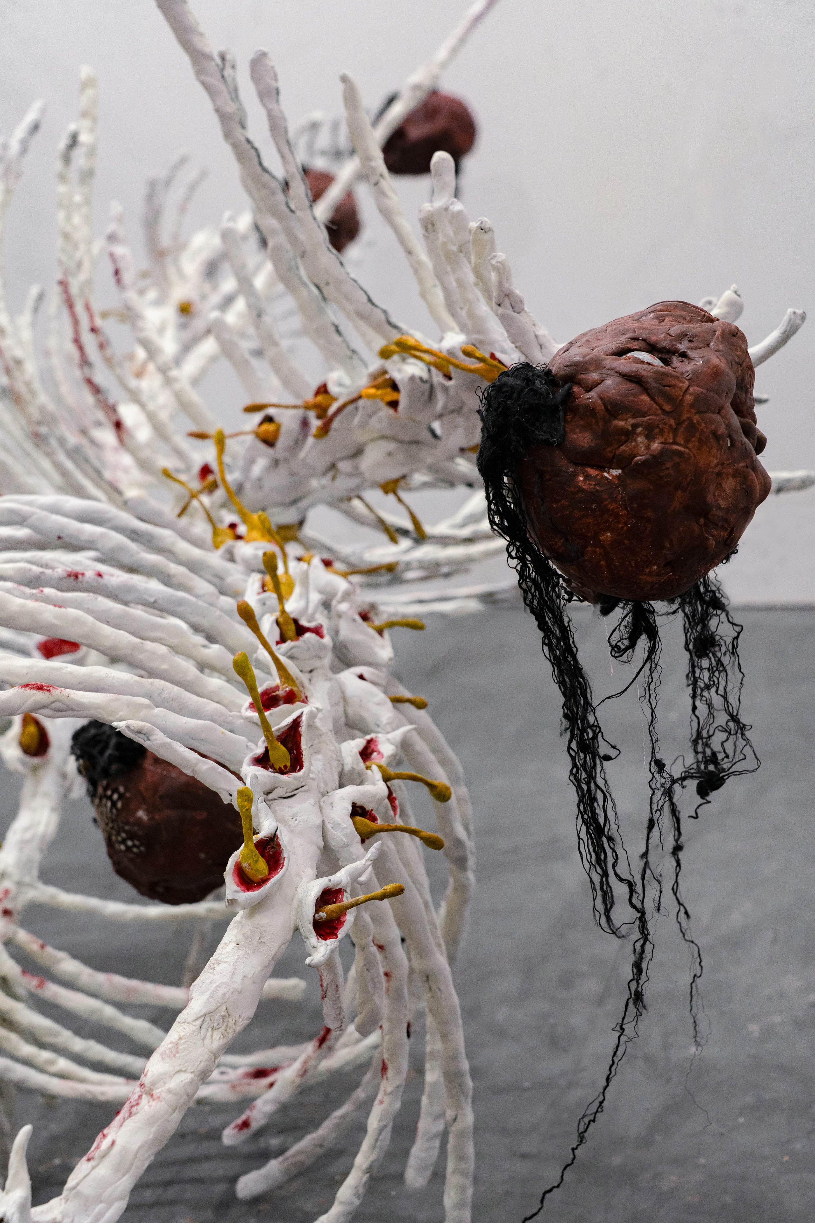 steel rod, epoxy clay, mica, silk, teeth, feather